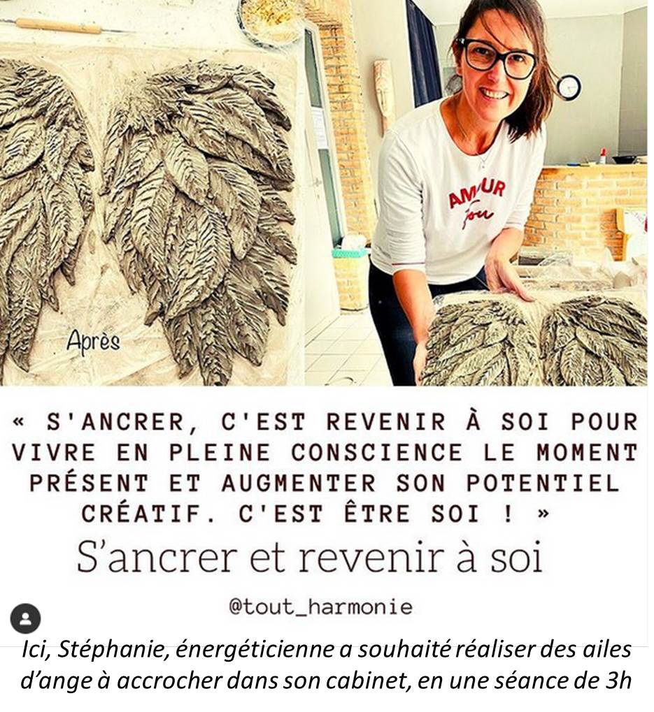 « Super moment passé avec Gwen sur ma 1ère sculpture chef d’œuvre de ma vie (tout commentaire négatif sera supprimé je vous préviens on ne critique pas l’artiste 🤣🤣🤣) !!! Franchement c’était génial je me suis bien amusée à créer mes ailes d’ange ! Résultat dans un mois ! » Stéphanie
