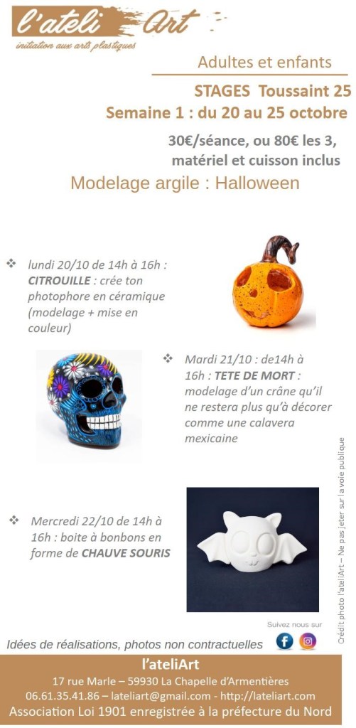 lundi après-midi, mardi soir, jeudi matin à l’association l’ateliArt à la Chapelle d’Armentières (59), reprise le 15 septembre, accessible à tout moment pour 1 ou plusieurs séances, projet personnel.